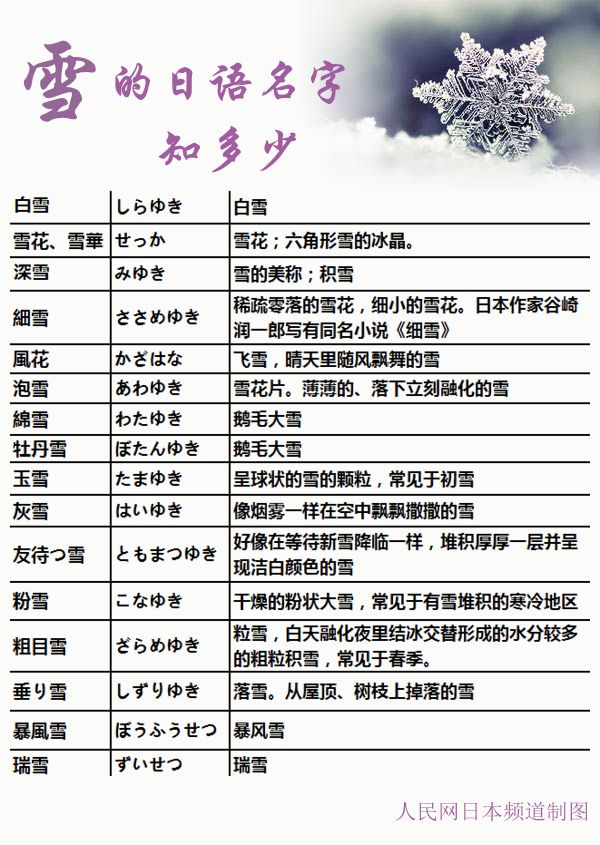 2015年第一场雪 14日降临北京城。关于“雪”,中文里有暴风雪、瑞雪、残雪等说法,日语中也有许多关于雪的、优美的词汇。让我们一起来学习一下吧。 今日互动问题:“瑞雪兆丰年”用日语怎么说?