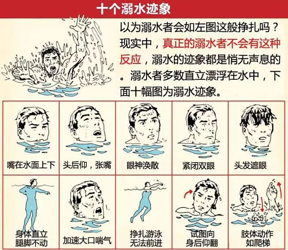 即将溺水的孩子:眼睛睁着,嘴巴半闭,身体垂直,有时候嘴巴在水上,有时候在水下,上下漂浮。但最主要的是,身体都是垂直的。