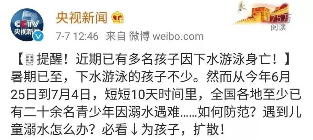 夏天,是溺水的高发季,到底有多高呢?央视新闻的一条微博说,从6月25到7月4日,仅仅十天的时间,就有20多名青少年溺亡。
