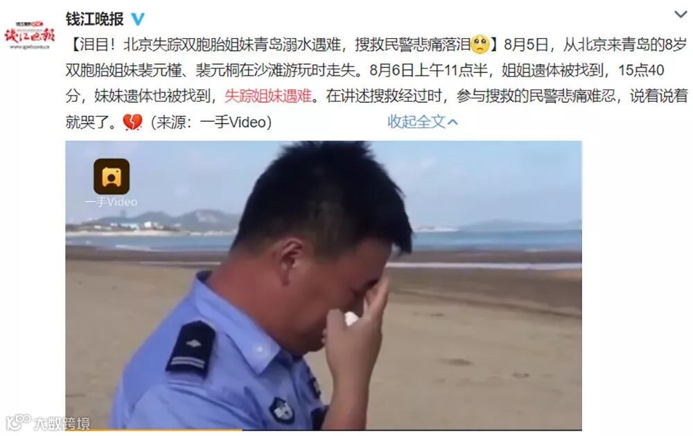 这俩姐妹今年八岁,北京人,这次是跟着妈妈来青岛度假的。失踪时,身穿泳衣,赤着脚。妈妈报警后,黄岛区公安部门组织警力紧急寻找这两个孩子,朋友圈也都在转发接力寻找孩子。