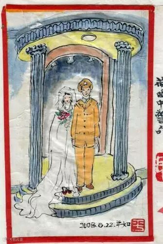 結婚衣装の姿。「婚礼後、美棠と私は礼堂の入り口で記念撮影をした。この写真はもうないが、私の記憶の中には残っている」。