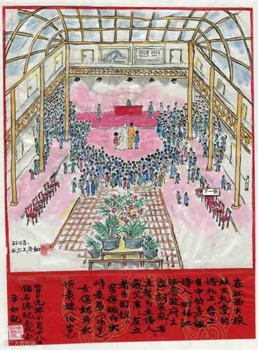 結婚式。1948年に江西大旅社大礼堂で結婚式を挙げた。台上の中央は立会人で、当時の江西省政府の胡家鳳主席。右に立っているのは司会の私の父親、左が司教。