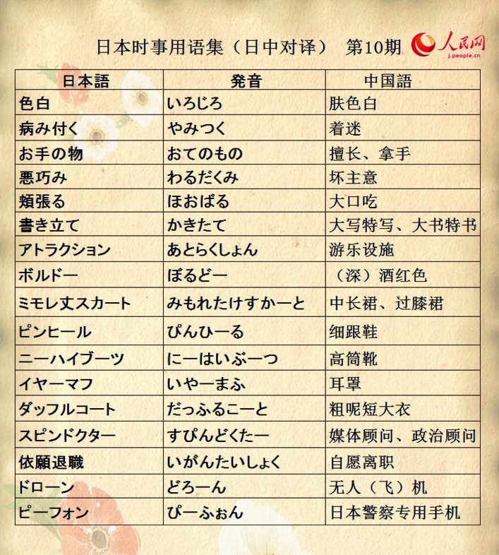 为方便读者理解日本新闻,学习报道中的新词,人民网日本频道开设《日本时事用语集(日中对译)》板块。板块中广泛收录日本新闻报道中常用的政治、经济、社会、文化等方面的词汇,并将定期更新。希望该板块能够给读者朋友们带来帮助。