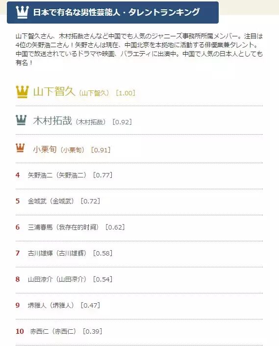 「男性芸能人」で4位となった矢野浩二さんは、レコードチャイナの取材に対して「この2年はレギュラーのバラエティー番組から退いて俳優活動中心ですが、以前と変わらず関心を持っていただき、応援していただいていることに感謝しています」とコメントした。また、最近、北京で乗ったタクシーの運転手から「あんたがいた『天天向上』は面白かったよ。私にとって、たまの息抜きはバラエティー番組を見ることなんだ。最近、バラエティー番組であんたを見られないのは寂しいな」と言われたという。矢野さんは今後、『天天向上』の舞台に再び上がるかどうかは分からないとしているが、「一人でも自分に期待している人がいるなら、その人のために僕は今できる方法でその人を楽しませることを考えていきます」と語った。