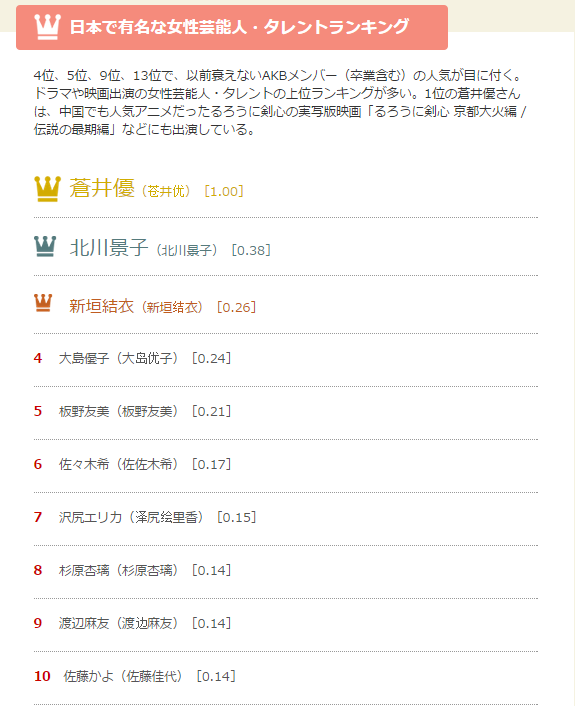 百度は24日、2014年に検索されたキーワードのうち、日本に関するキーワードをカテゴリ別に抽出したランキング結果を発表した。「日本のドラマ」では、「昼顔~平日午後3時の恋人たち~」が、他を圧倒する勢いで年間検索回数1位となった。2位は「SCANDAL」、3位は「半沢直樹」だった。「男性芸能人」は1位が「山下智久」、2位「木村拓哉」、3位は「小栗旬」という結果だった。「女性芸能人」は1位の「蒼井優」が群を抜いて人気が高く、2位に「北川景子」、3位に「新垣結衣」が続いた。また、行ってみたい都道府県の「旅行」部門では、1位の「北海道」の人気が非常に高く、2位は「東京」、3位は「神奈川」という結果となった。