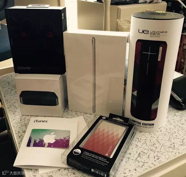 普通版福袋:一台16GB iPad Air 2、一台16GB版iPad mini 3+Ultimate Ear Boom无线蓝牙扬声器(二选一)、一台AppleTV、一个限量版Incase Icon Slim背包、一副Powerbeats 2 无线入耳式耳机、一个限量版MophieJuice Pack Powerstation电源。总价格折合人民币5808元(6344元)。