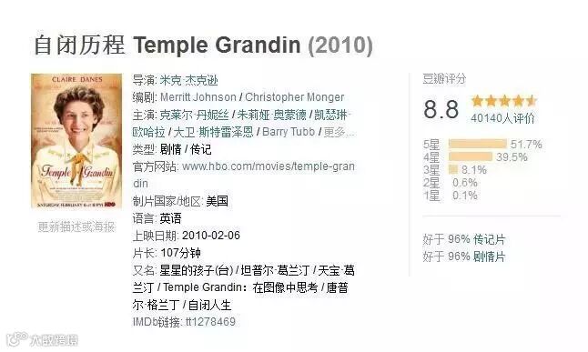 曾经被一部根据美国动物科学家坎普·葛兰汀的自传而改编的电影《自闭历程》感动,而这位著名科学家就是一位自闭症患者。