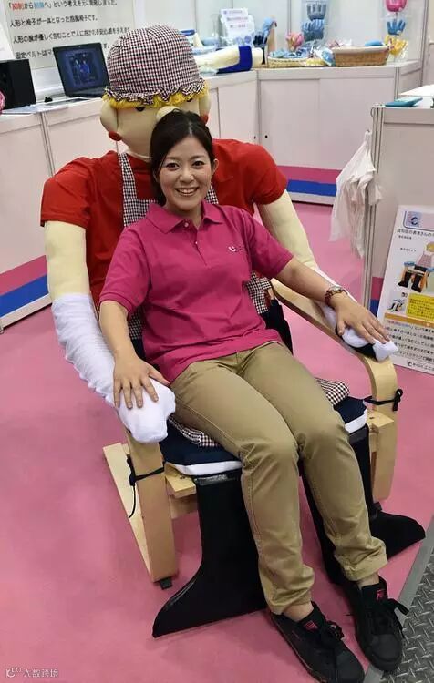 ユニケアが考案した「やすらぎチェア」は、実際の人間より大きい布製の人形が組み込まれ、座ると長い腕で抱きしめてくれる。同チェアは、孤独を感じやすい高齢者に安心感を与えるために考案された。