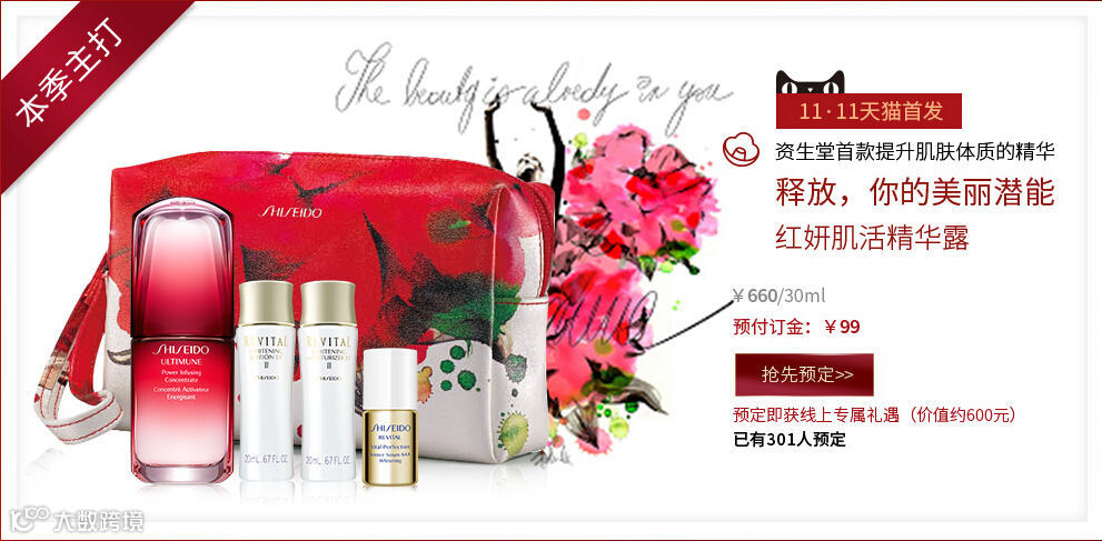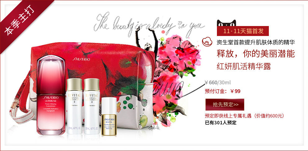 此款精华是即将于双11当天首发的新品,限量1000份。现在预定,即可享受专属礼遇,含悦薇润白柔肤水EX220ml、悦薇润白活肤乳20ml、悦薇珀翠馥活润白精华液10ml及法国知名插画设计师定制版化妆包,礼遇价值约600元。