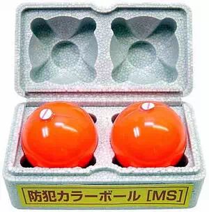 这是日本针对犯罪行为的装备中最常见的一种物品,球体中装有能在黑暗处发光且具有强烈刺激性气味的有色液体,当球体受到冲击时会爆裂,里面的液体会外泄出来,从而在罪犯身上留下标记,以便警犬追踪。