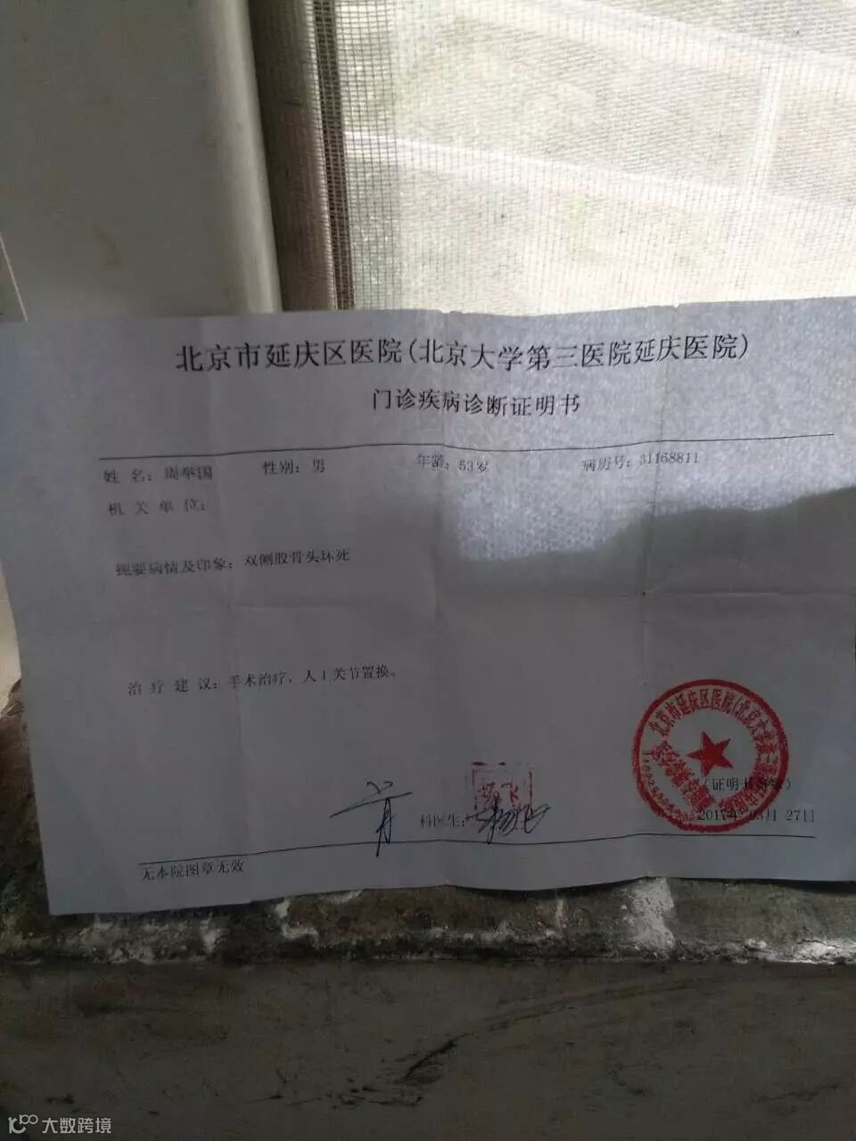周举国在延庆县医院查出双侧股骨头坏死,医生建议手术治疗,人工关节置换。