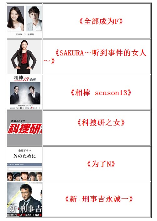高收视率的保障、解谜系推理《相棒》、《科搜研之女》在这个秋季又将与大家见面。除了以警察为主角的推理日剧外,《全部成为F》、《为了N》等由畅销小说改变成的精美作品也悉数登场。而《新·刑事吉永誠一》、《SAKURA―》等新型刑侦剧在这一季的表现也值得关注。