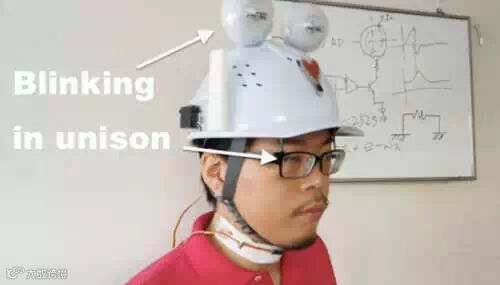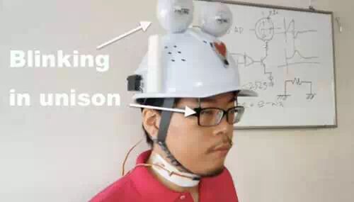 同装置はヘルメットでできており、目玉型のガジェットはカエルの目そっくりでかわいい。フォトインタラプタがまばたきを検知すると、その「目」もまばたきする。また、赤外線式心拍計「HeartCap」も搭載され、使用者の心拍数が早くなると、ハート型の心拍表示LEDが点滅する。そのようにして、使用者の緊張や興奮が可視化される。