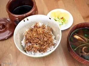 丼によそったご飯にうなぎのタレを塗っていきます。漬物の小鉢、お麩と三つ葉の味噌汁を添えて、「限定うなぎのタレ丼」セットの完成。