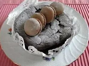 ガトーショコラの上にベリーソースが挟まれたマカロンが乗っている可愛らしいスイーツ