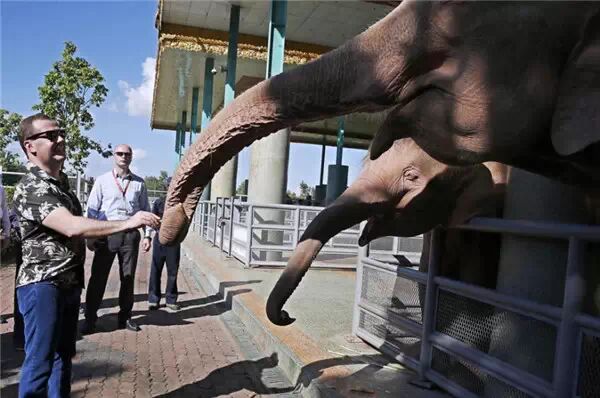 現地時間2014年11月13日、ミャンマーの首都・ネピドーで、現地の動物園を見学して象に餌をやるロシアのメドベージェフ大統領。