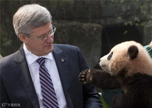 2012年2月11日、重慶動物園で、パンダと対面するカナダのハーパー首相。