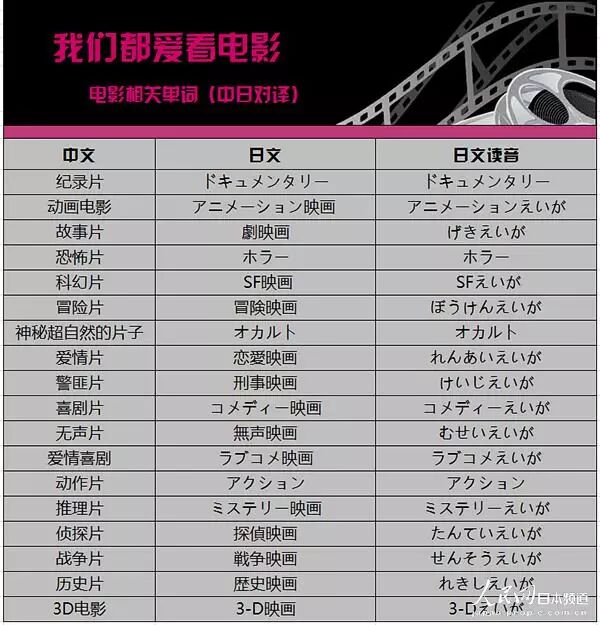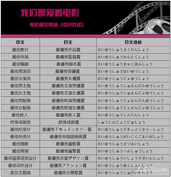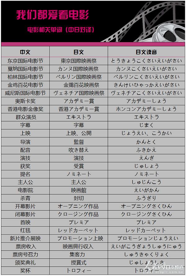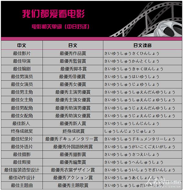 第27届东京国际电影节的影片大战正在日本东京激烈地上演,爱好电影的朋友在焦急等待获奖名单的同时,学习一下电影相关单词的日语说法也是个不错的选择。没准在奖项揭晓之时,你可以第一时间确认自己关注的影片和演员是否获奖!人民网日本频道已经为大家倾情总结了一番,还不赶快拿去收藏?!(ps:中国导演李睿珺的新作《家在水草丰茂的地方》已经入围本届电影节的主竞赛单元参与竞争角逐,那么所谓的“主竞赛单元”用日语怎么说呢?请将本条微博看到最后哦~)