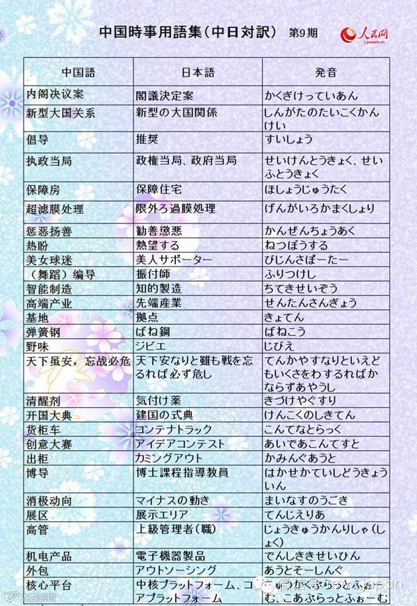 人民網日本語版は、中国の新聞報道を翻訳した記事を理解する上での手助けとなるため、「中国時事用語集(中日対訳)」を開設しました。「中国時事用語集(中日対訳)」には中国の新聞報道に使用される政治・経済・社会・文化・法律などの用語を幅広く収録し、定期的に更新する予定です。読者の皆様のお役に立てれば幸いです。