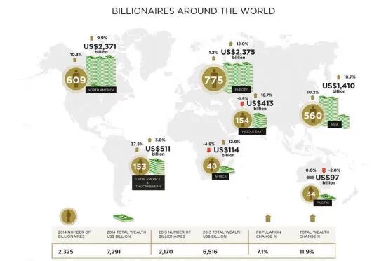 2014年、10億ドル以上の純資産を保有しているビリオネアの数は、世界で2325人と、前年比155人(7%)増加した。彼らの資産総額は、前年比12%増の7兆3千億ドル(約797兆3100億円)。ビリオネア2325人を地域別に見ると、欧州が最多で、北米とアジアが続いた。しかし、資産の増加スピードについては、アジアのビリオネアが世界トップだった。2014年、アジアのビリオネアの資産総額は1兆4100億ドル(約154兆円)、前年比18.7%増加した。