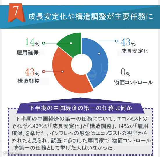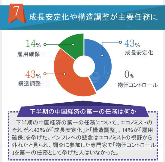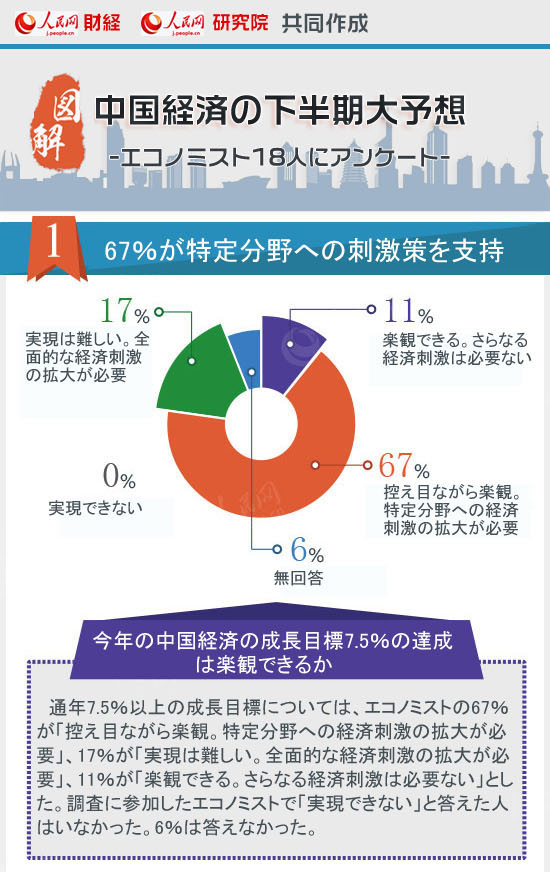 中国経済は現在、急速なギアチェンジや痛みを伴う転換、従来の刺激策の消化のプロセスをたどっている。上半期のデータからは、中国経済が巨大な下方圧力にさらされながらも、合理的な範囲での動きを保っていることがわかる。成長率の落ち着いた「新たな常態」はリスクを解消しつつ強化されている。中国経済は下半期、7.5%の成長目標を保つことができるのか。構造調整はどのような困難に直面しているのか。下半期の第一の任務は何か。金利や株価指数はどう動くのか。人民網はこのほど、18人のエコノミストを対象としてアンケートを実施し、中国経済についての9つの判断を導き出した。