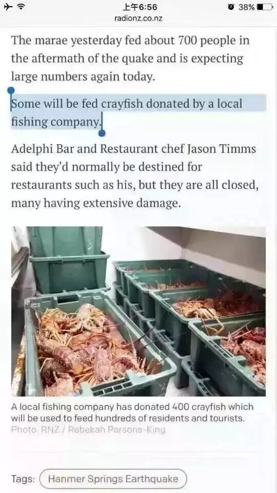 据说大龙虾成为了新西兰地震的赈灾物资…… 有当地商家捐了400只……摊手。虽然遭受了重大创伤,不过美食是抚慰人心最好的礼物不是么……