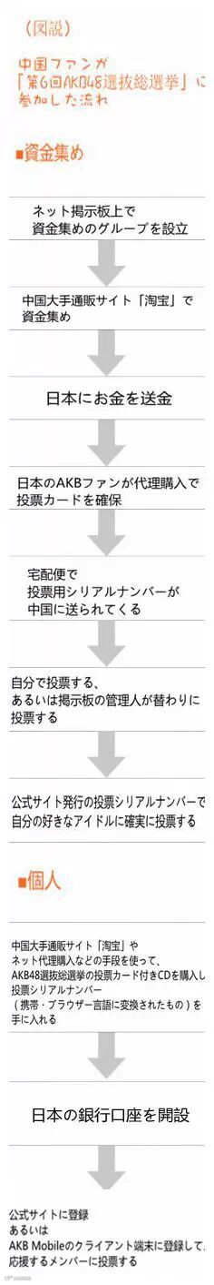 今年、中国の大手ポータルサイト「百度」の渡辺麻友板のファンたちは淘宝で資金計180万元を集めて、総投票数15万9854票のうち約3万5000票を投票し、渡辺麻友の1位獲得を大きく後押しした。資金集めに参加した1人のファンによると、渡辺麻友板の管理人たちは全員が幹部による資金ファンドに参加し、3万5000万の票を集めた資金総額も掲示板で公開したという。また「淘宝」のショップから資金を集めた後、管理人はツテを頼って日本で信頼性の高いIDを使ってネット購入した。このファンは、今年の「玉林軍」が必死で資金をかき集めた現象はおそらく「速報」の影響だという見方を示した。総選挙の速報の結果で、2位に位置する渡辺麻友と暫定トップの指原莉乃との差が1万2299票とかなり開いていたことが刺激となって、「玉林軍」は総力をあげて投票したことが最後の大逆転劇を生んだのだという。