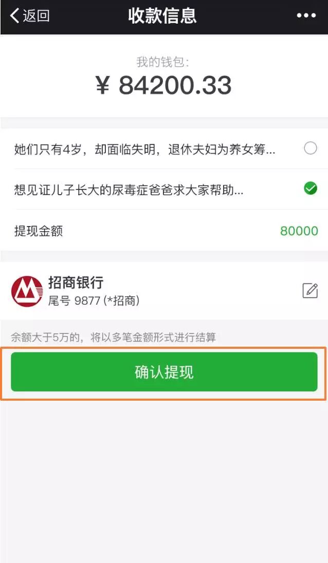 依托易宝支付完善的资金系统,“益童帮”筹款事件的结算做到了简单快速,安全严谨,筹款事件结束后,在【钱包】中可随时提出善款结算。收到用户结算指令后,专业的资金审核工作人员会在1-3个工作日内完成审核,结算到用户收款账户。