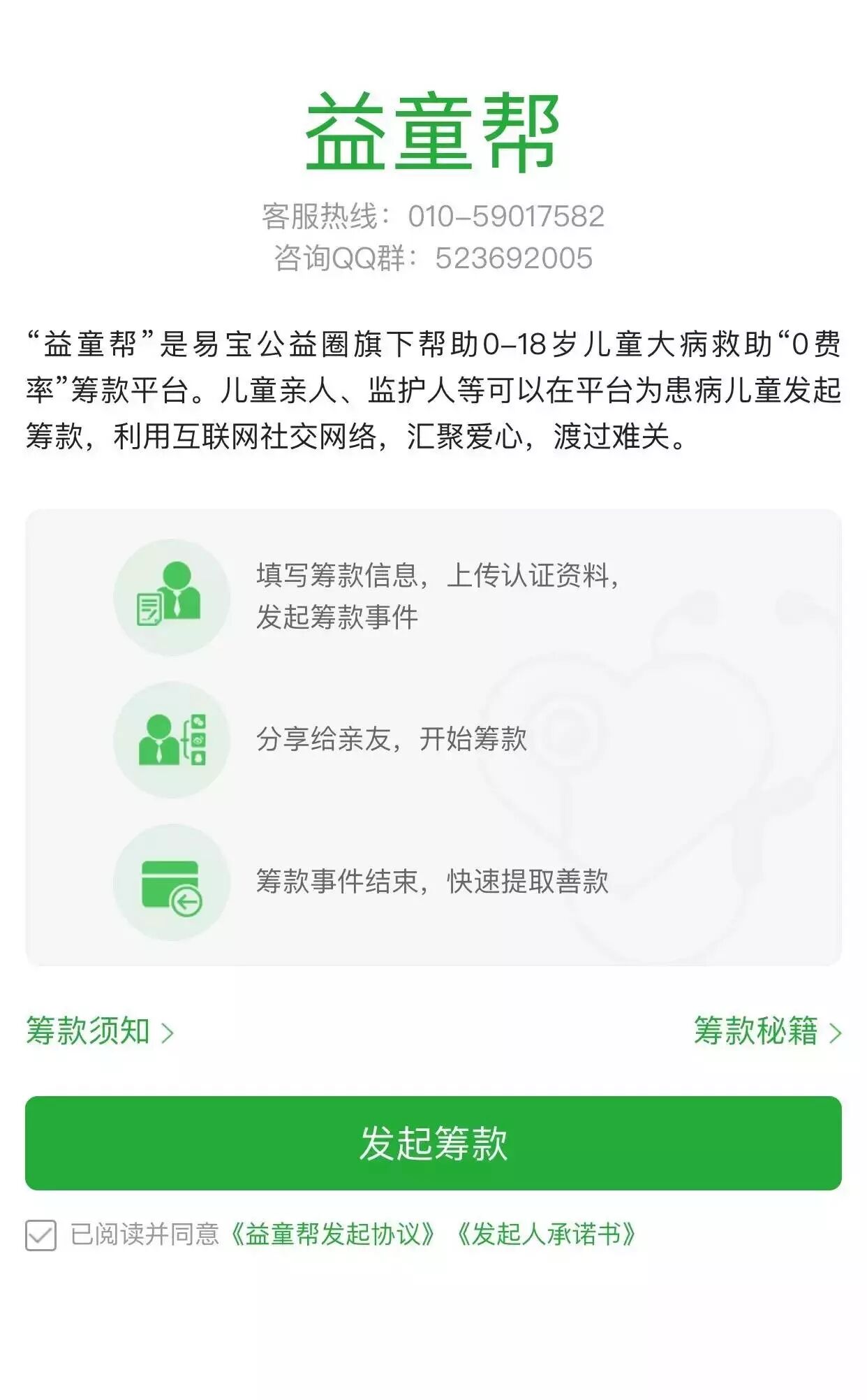 “益童帮”基于社交平台的便捷属性,发起简单,筹款高效,在易宝公益圈微信公众号上点击【我要筹款】即可快速发起筹款,及时寻求大家帮助。平台不收取任何手续费用,保证每一笔支持款项都给到受助者用于治疗及摆脱困境,让每一份爱心都能得到完整的传递。