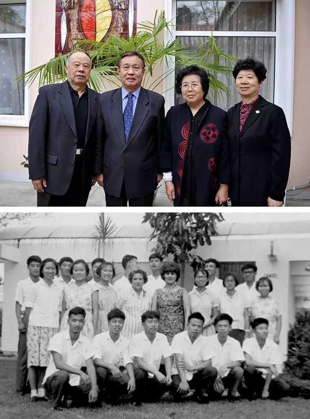 4月18日、在中国キューバ大使館の前で記念撮影する王世鐸さん(左端)と50年前一緒にキューバに留学した同級生(上写真)。1965年、キューバ・ハバナ郊外の学校で先生と記念撮影する王世鐸さん(前列右から3番目)と同級生(下写真)。