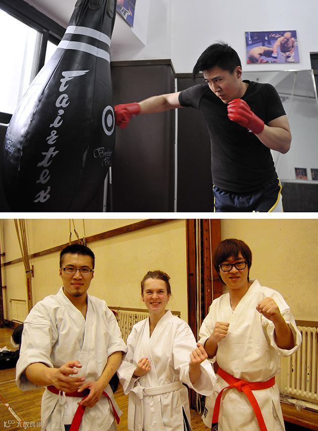 4月19日、北京のあるボクシングクラブでボクシングを練習する紀喬上さん(上写真)。2010年12月15日、バーミンガム大学で空手を学ぶ同級生と記念撮影した紀喬上さん(左)(下写真)。