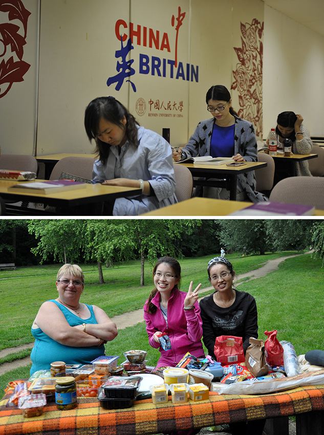 4月19日、人民大学で人的資源管理のコースを学ぶ王桜菲さん。仕事の間に自分を「充電」している(上写真)。2011年7月3日、英国・サリーのギルフォード公園でピクニックする王桜菲さん(中央)と母親(右)、英国の友人(下写真。資料写真)。