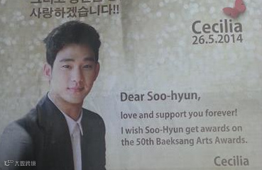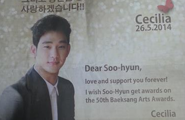 Ceciliaさんは韓国語と英語の両方で「百想芸術大賞の受賞を祈っています。私は永遠にあなたを応援し、愛しています」というメッセージを載せた。掲載した新聞社によると、このファンは香港のある富豪の妻で、この広告を通じてキム・スヒョンを応援したいと希望したという。