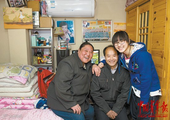 北京・三里屯の自宅で、鄧華さん(左)一家3人。鄧華さんは体に障がいがあり、あまり働くことができず、一家はコミュニティーの生活保護世帯だ。娘は中学3年生で熱心に勉強し、絵を描くのが好きだ。聞き分けのよい娘はこの貧しい家族の幸福と希望の源だ。
