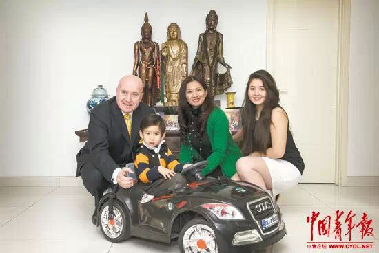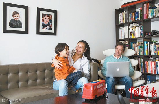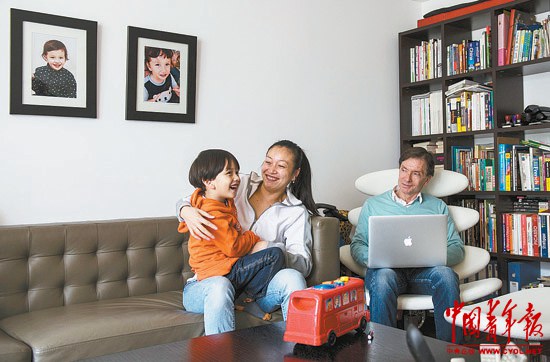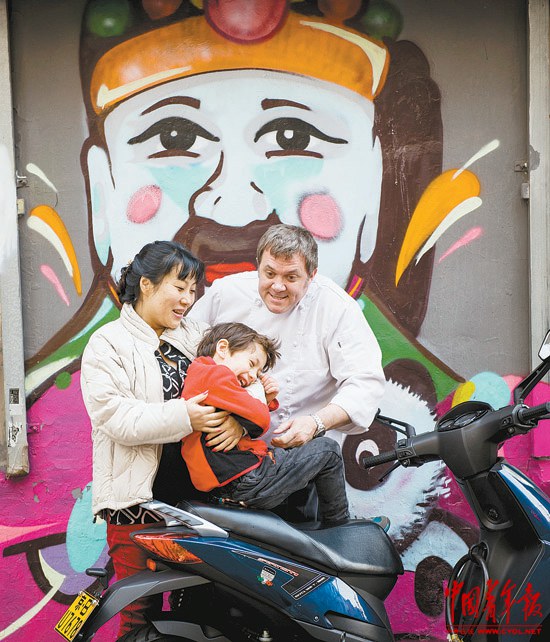 白雲竜さん一家3人。白雲竜さんは米国出身で、北京・三里屯でレストランを経営している。妻は中国人で5歳の息子がいる。2009年以降、彼はずっと三里屯で暮らし、働いてきた。コミュニティーサービスや公益活動に熱心に参加する彼は「西洋の雷鋒」と呼ばれている。