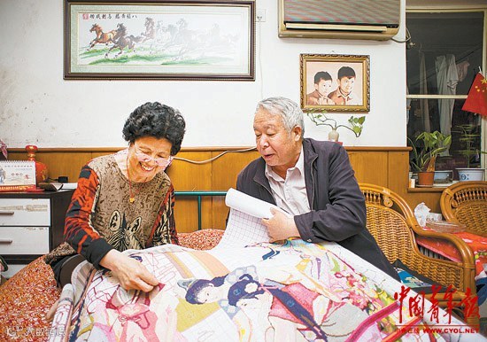 妻と一緒に三里屯の自宅で刺繍をする牟継源さん(右)。牟継源さんは弁護士だったが、退職後はその職歴を生かしてコミュニティーの法律顧問をつとめ、近隣住民のために法律の支援を提供し、住民が法的手段で問題を解決するよう手助けしている。