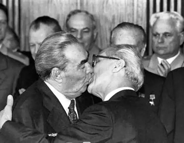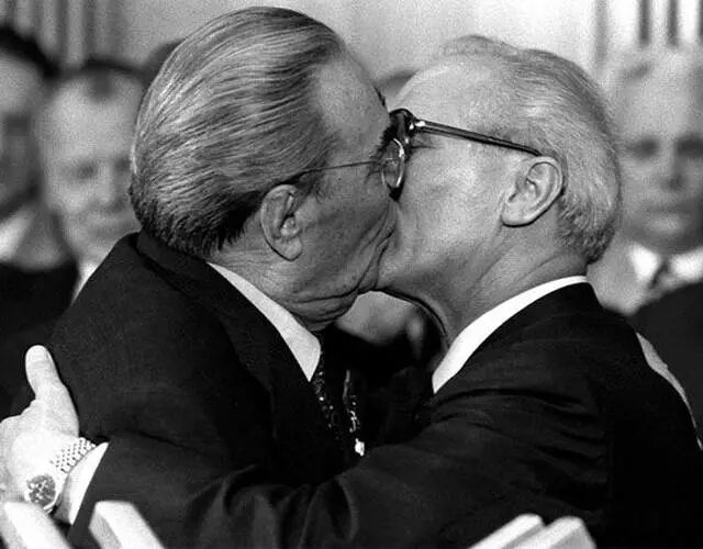 1979年10月4日,勃列日涅夫(左)与东德领导人昂纳克(右)在庆祝民主德国建国30周年庆典上激烈拥吻。