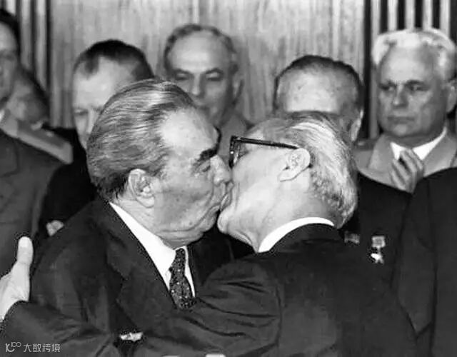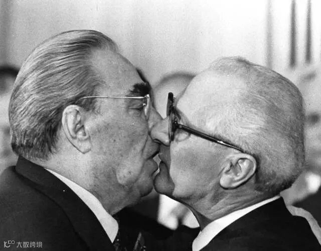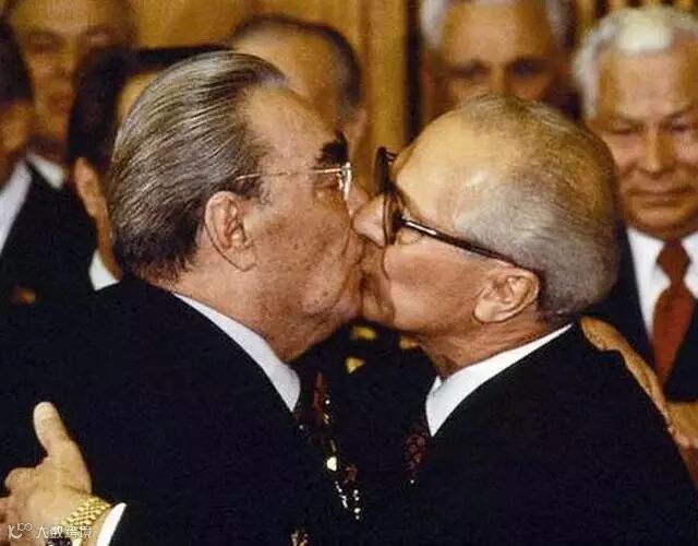 勃列日涅夫“三重吻”如此著名,以至于那个时代的普通中国人误以为接吻是国际场合商标准的外交礼仪。1979年10月4日,勃列日涅夫(左)与东德领导人昂纳克(右)在庆祝民主德国建国30周年庆典上激烈拥吻。