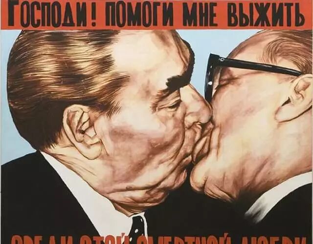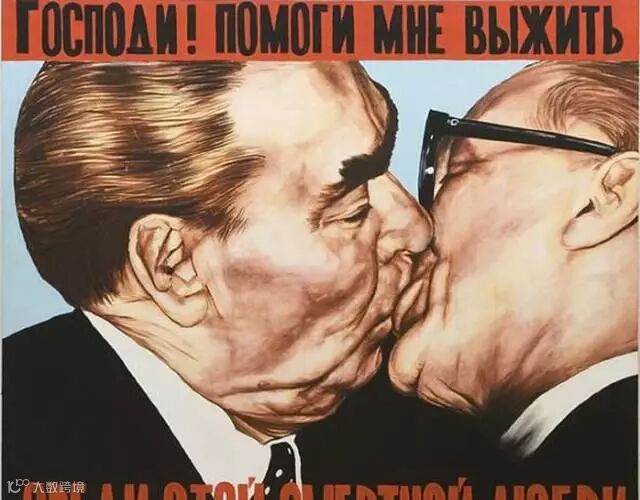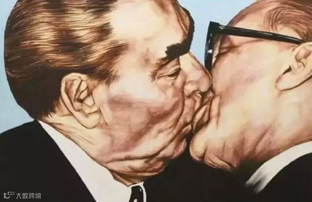 勃列日涅夫与东德领导人昂纳克的亲吻照被艺术家搬上了柏林墙。