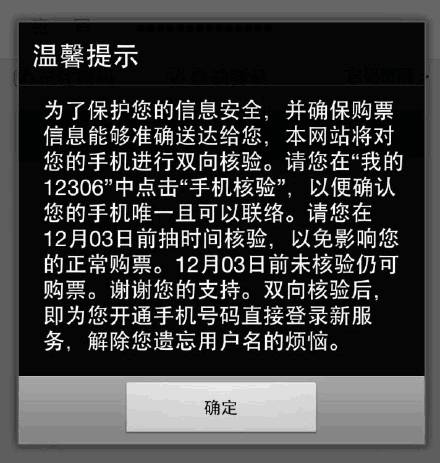 网上买火车票要双向验证了。这两天,打开手机12306客户端,页面自动跳出提示,要求进行手机双向验证服务。