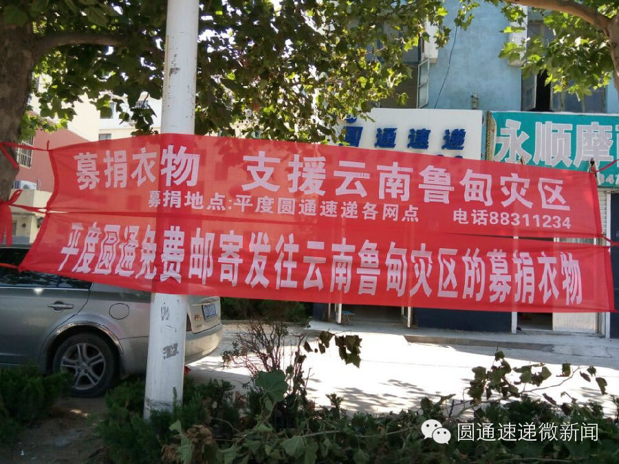 “云南鲁甸地震后,我们一直密切关注着灾情,看着震区人民受苦受难,我们心里很不好受。但离这么远帮不上什么忙,只能发挥我们公司业务长处,尽自己的一点儿力,希望能够帮助到震区人民。”平度圆通速递总经理韩亚平说,“我代表我们圆通速递在此做出承诺,凡是市民捐赠的物品、食品等救灾物资,我们圆通速递将在最短的时间内,免费发往鲁甸县灾区。想要捐赠的好心市民,请到我们圆通速递公司市区内任何一家业务点办理。”