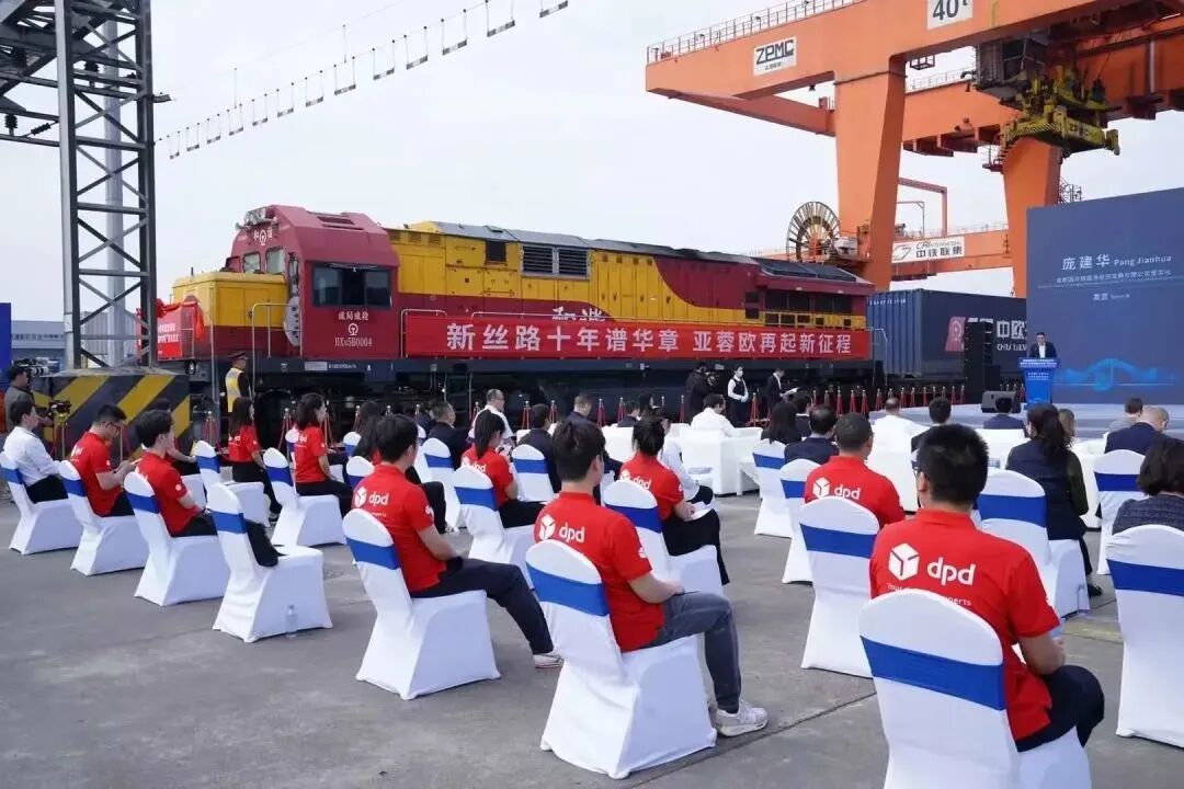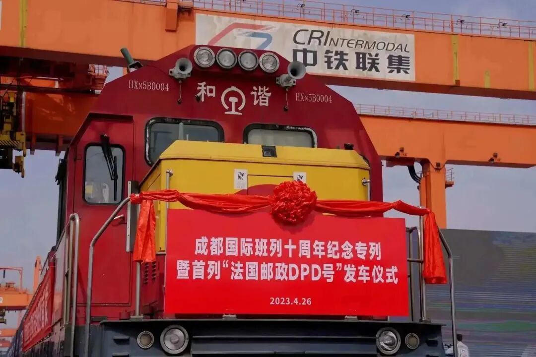 上午10:30,成都国际班列十周年纪念专列暨“法国邮政DPD号”发车仪式,在成都青白江区国际铁路港举行。