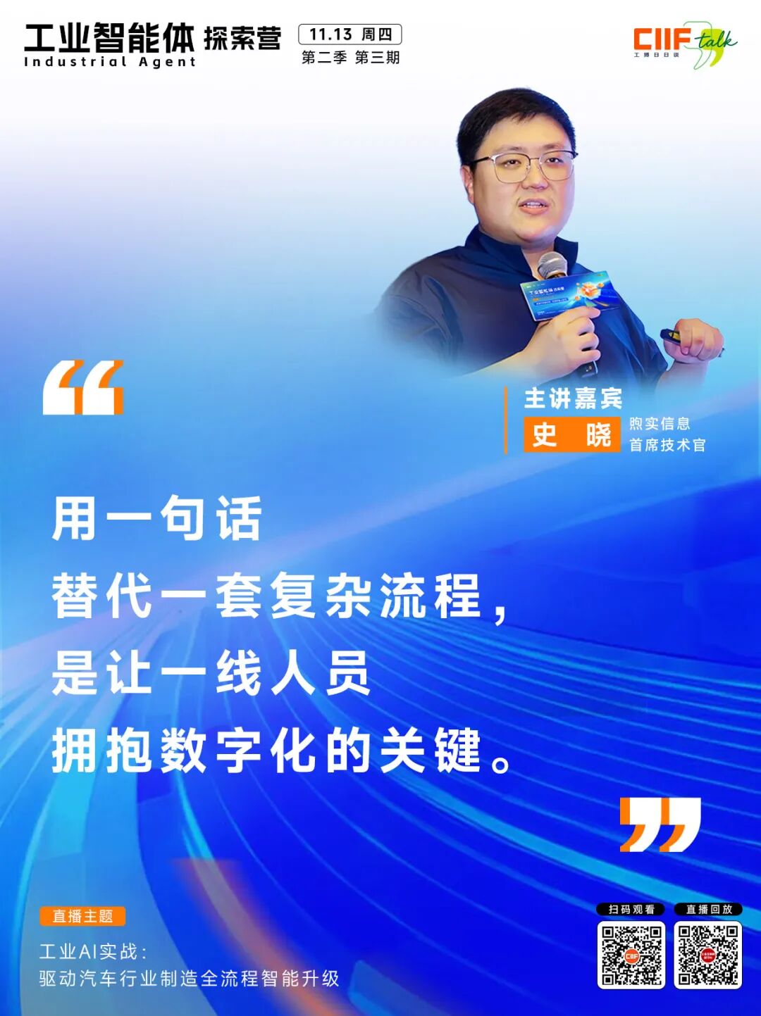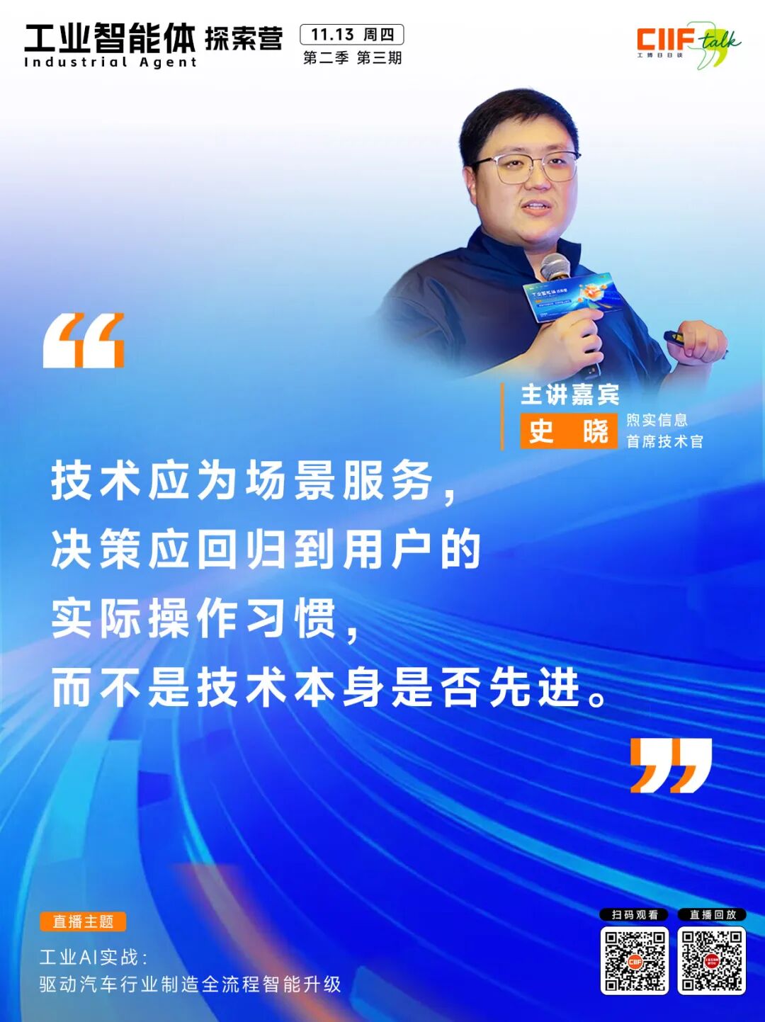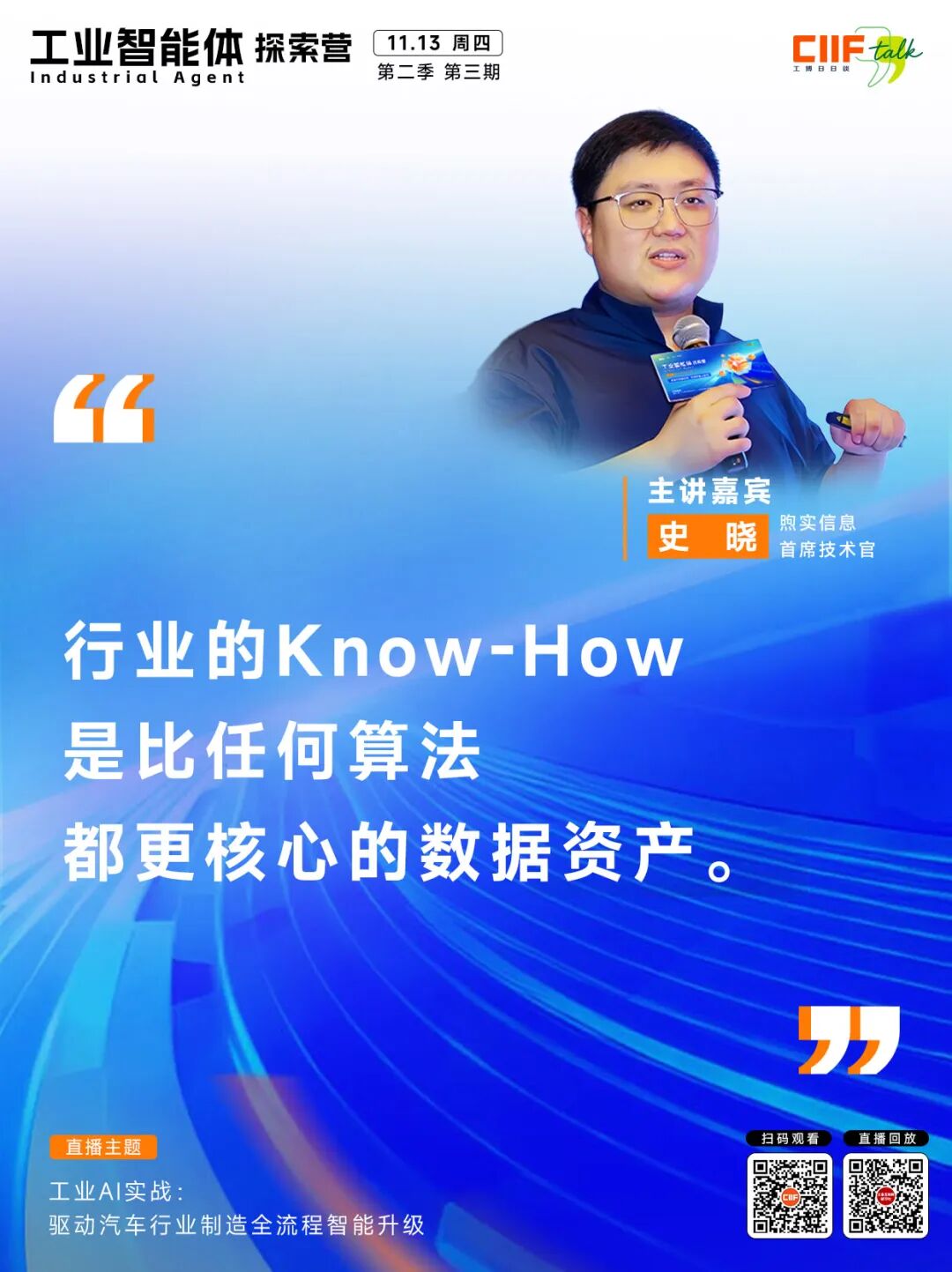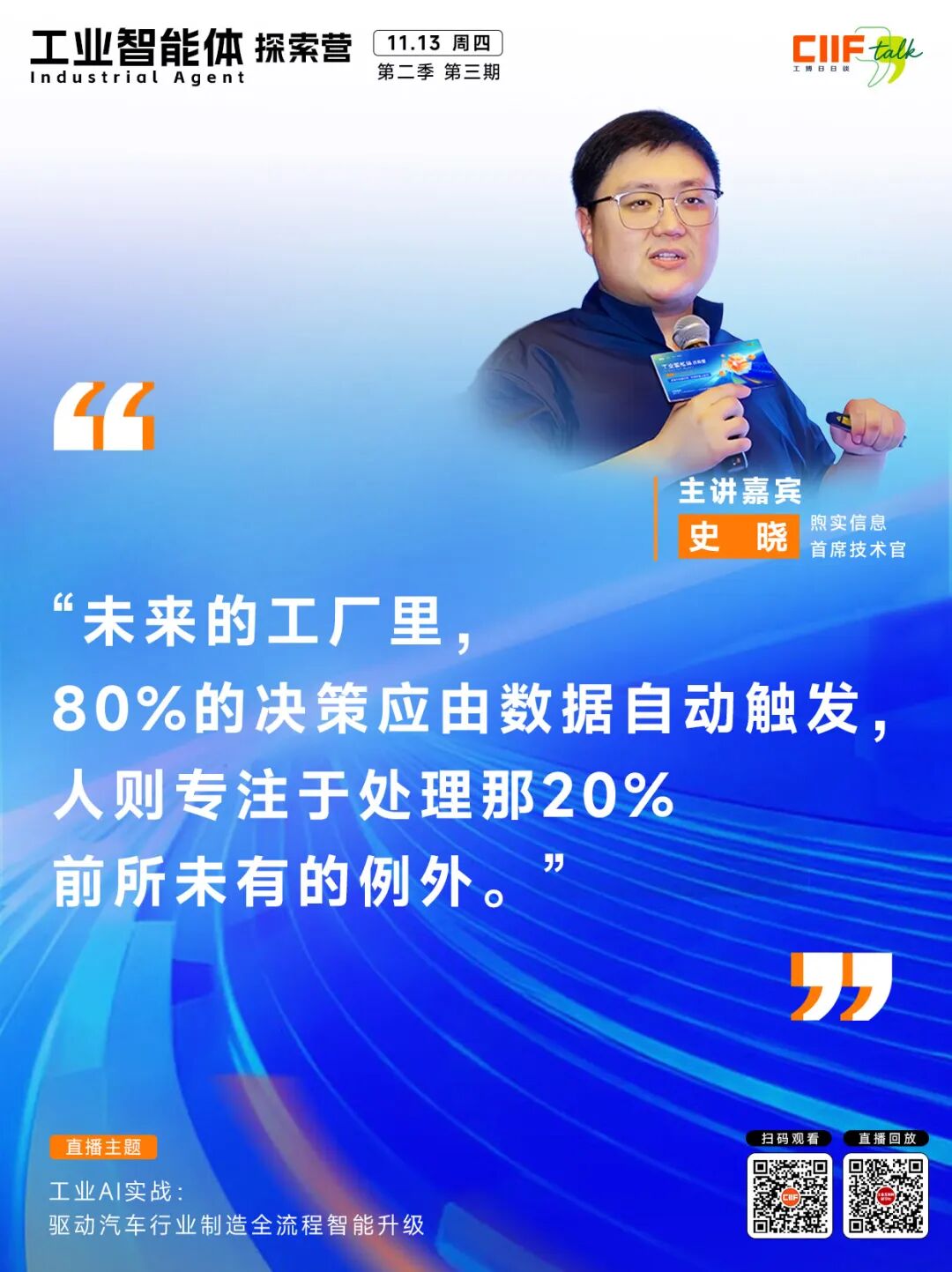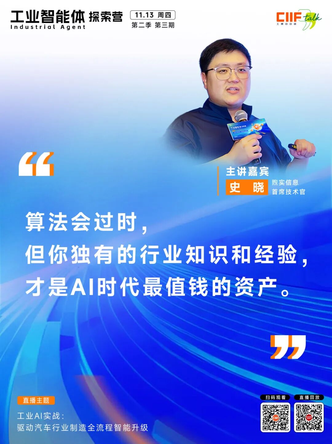 11月13日,「煦实 首席技术官 史晓」做客工业智能体探索营(第二季),分享工业AI实战:驱动汽车行业制造全流程智能升级主题直播。