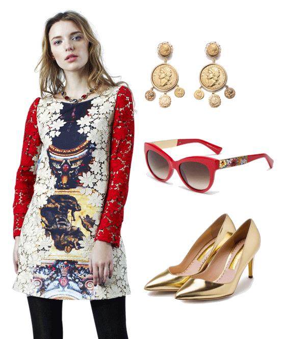 红与金的大面积拼接,在饱和色调中完美绽放,蕾丝花朵犹如少女般浪漫的情怀,为您的整体服装造型增添亮点,巴洛克壁画印花,奢华高贵、精致优雅。