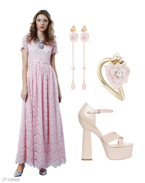 粉色蕾丝长款连衣裙,设计灵感源自沿地中海海岸线一带的度假。创作灵感糅合了浪漫主义,给人盈动的感觉。