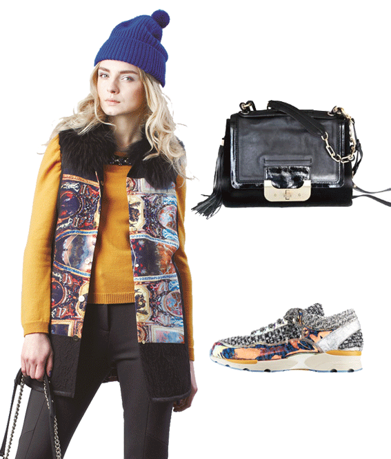 3、狐狸毛领棉质马甲,中间复古印花,两侧黑色压线设计,保暖又修身前饰,尽显贵妇气质。