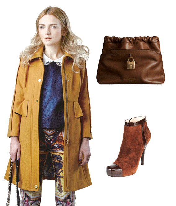 1、羊毛料素色外套,腰部荷叶边设计,修饰女性腰部线条,A型下摆,和腰部线条设计相呼应,优雅端庄。