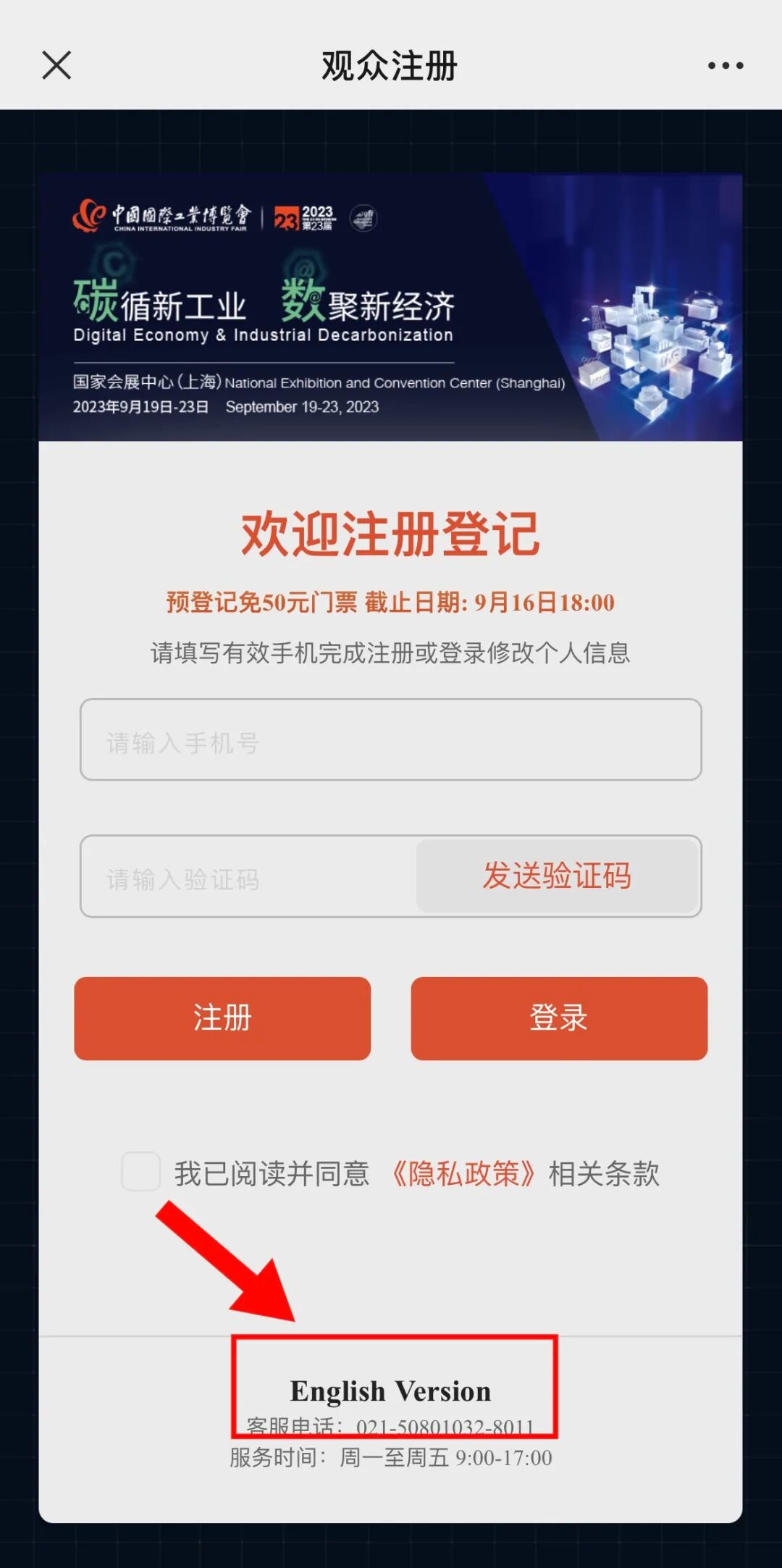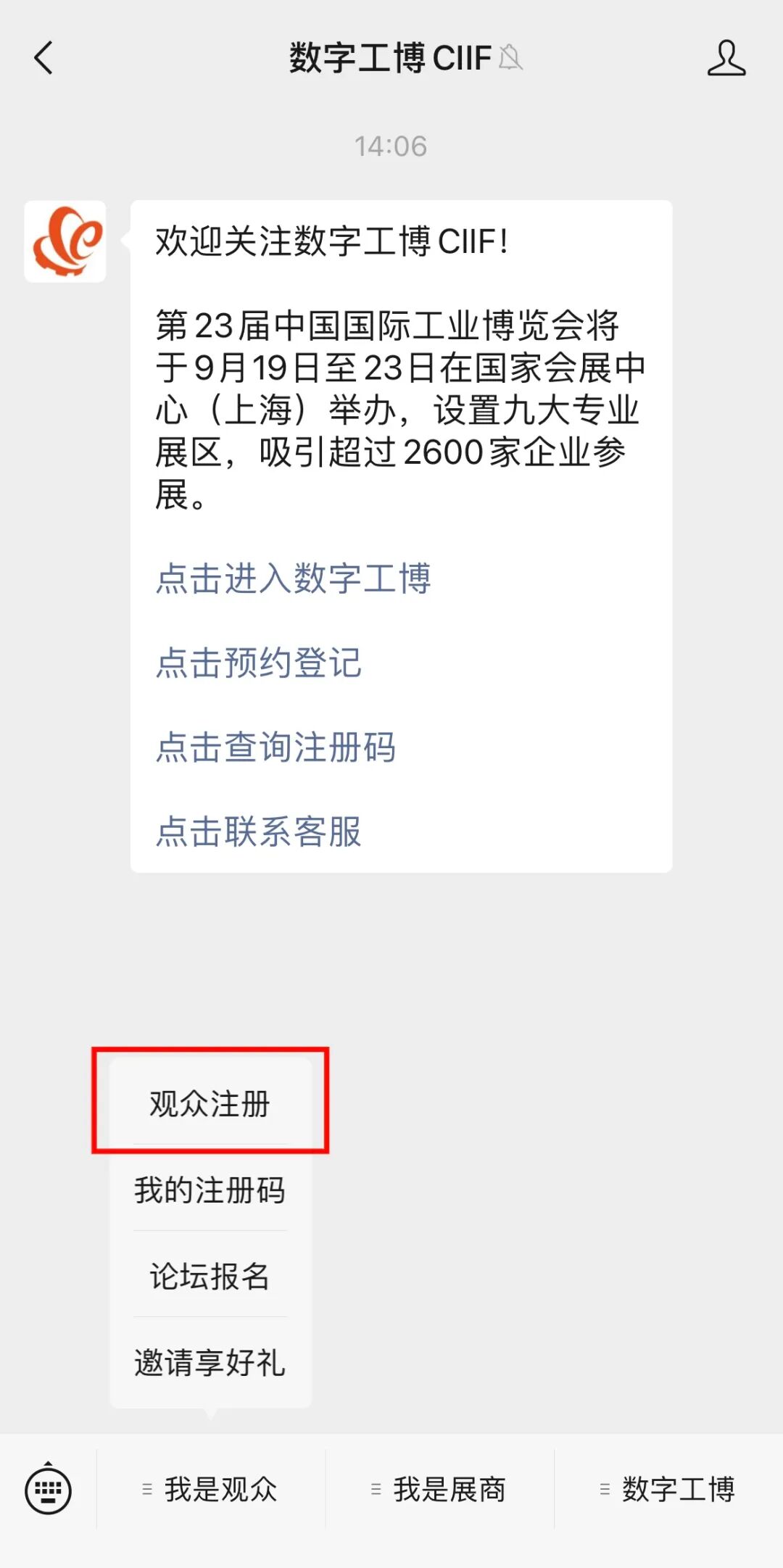 关注“数字工博CIIF”,点击菜单栏中“我是观众”→“观众注册”,填写有效手机,按步骤完成观众登记,已完成观众登记可点击观众登录修改个人信息。