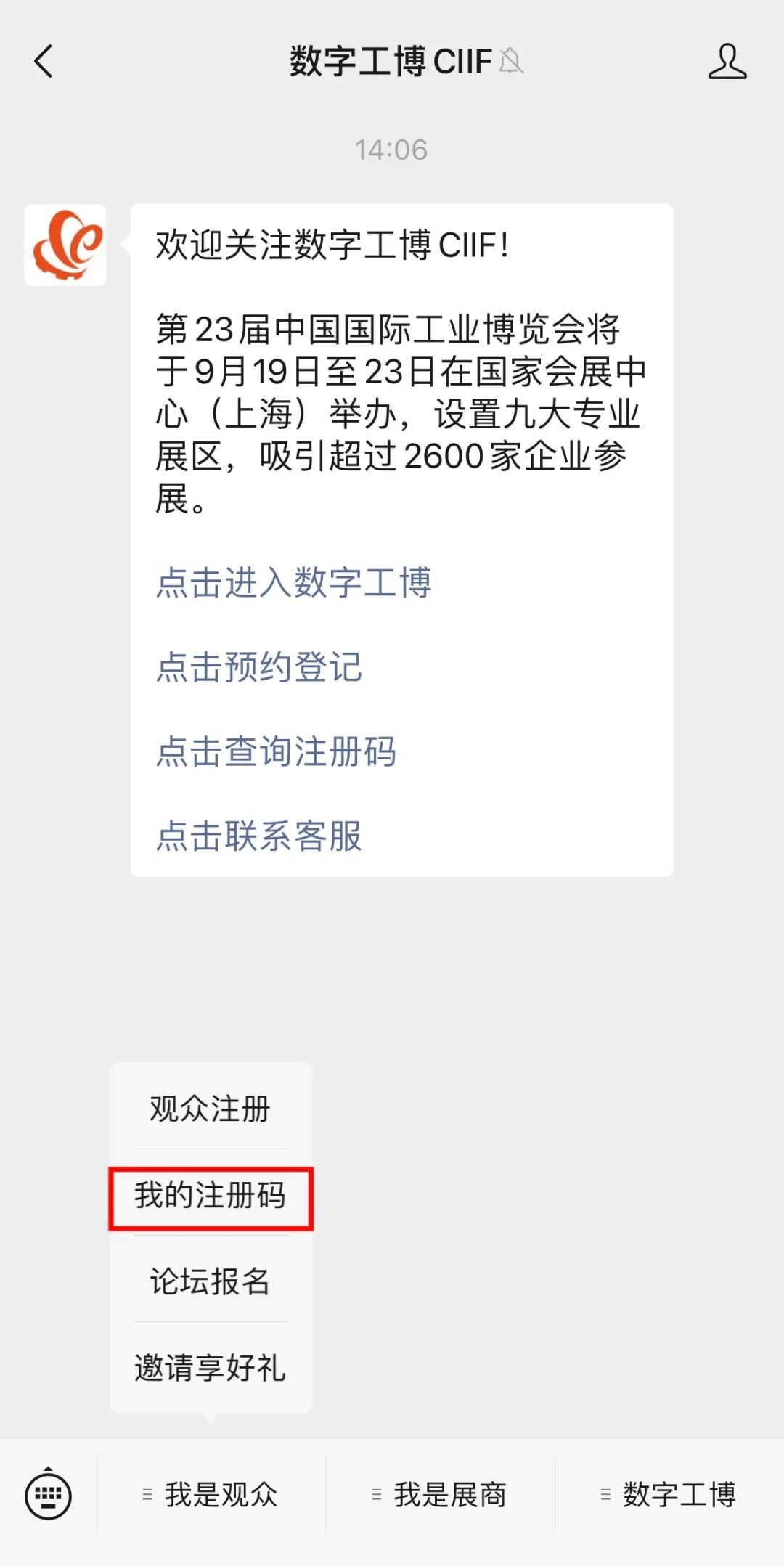观众注册完成以后,通过 “数字工博CIIF”底部菜单栏,点击“我是观众”→“我的注册码”,输入注册的手机号码即可查看并保存您的注册码。