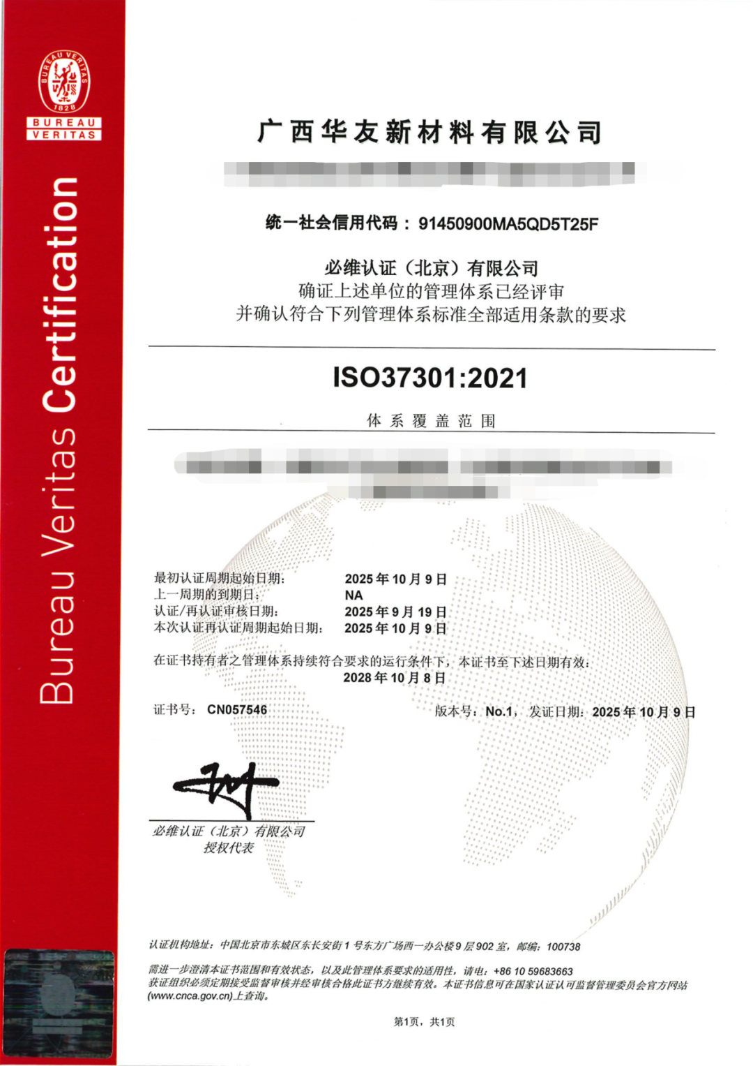 10月13日,必维集团(Bureau Veritas)向华友钴业旗下广西华友新材料有限公司正式颁发ISO 37301合规管理体系认证证书,为华友国际化战略奠定了坚实的合规基础。